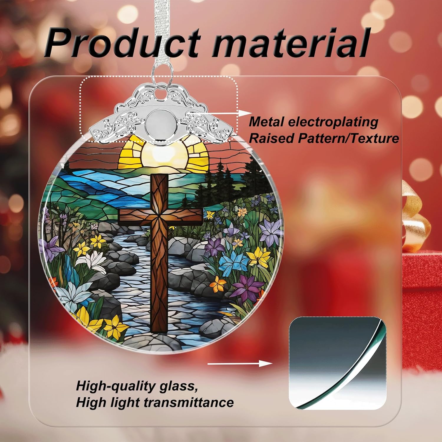 Cross Stained Glass Religious Christmas Ornament, Hanging Ornaments for Christmas Tree Decorations, Christian Gifts Holiday Keepsake Present Exchange Idea
