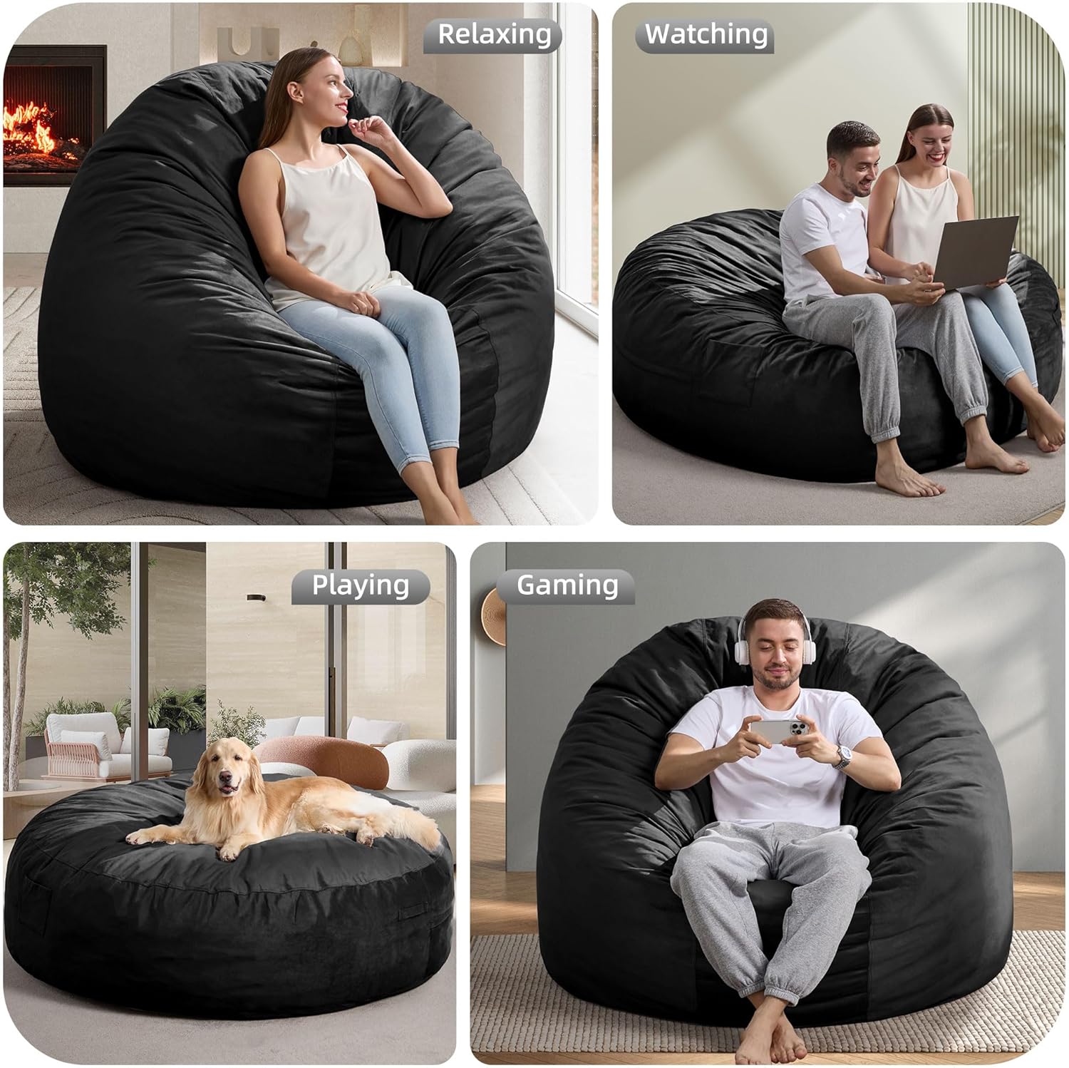 Hobestluk 6FT Bean Bag Chair Bean Bag Chairs for Adults Giant Bean Chairs with Velvet Cover, Memory Foam BeanBag Chair Fluffy BeanBag Chairs for Living Room, Bedroom- Black (70" x 70" x 15")