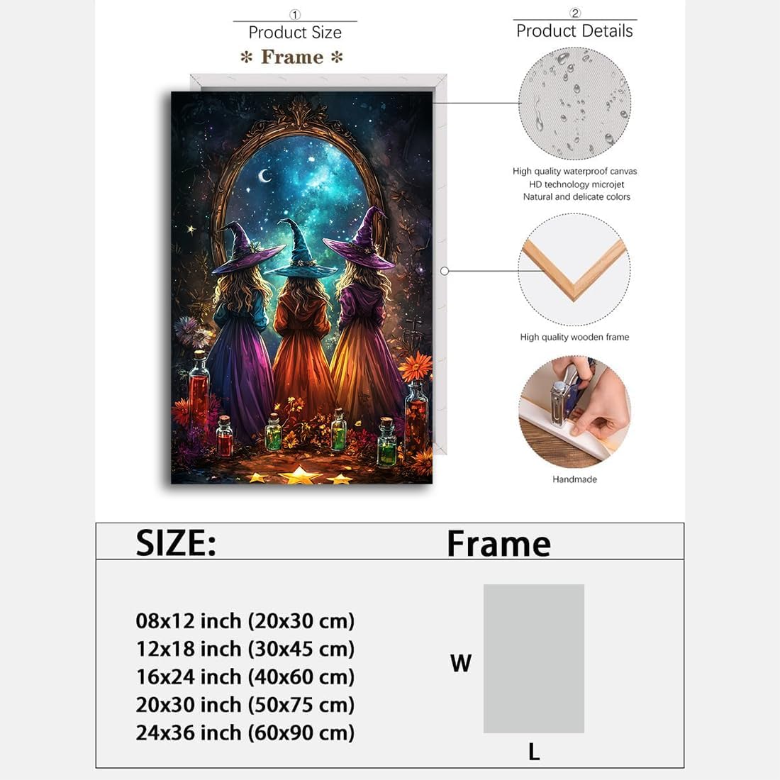 Witch Poster Halloween Fall Wall Art Decor,Three Witches with Magic Potion Mirror Colorful Vintage Print,Dark Academia Spooky Canvas Art Prints for Home Living Room,8"x12" Framed