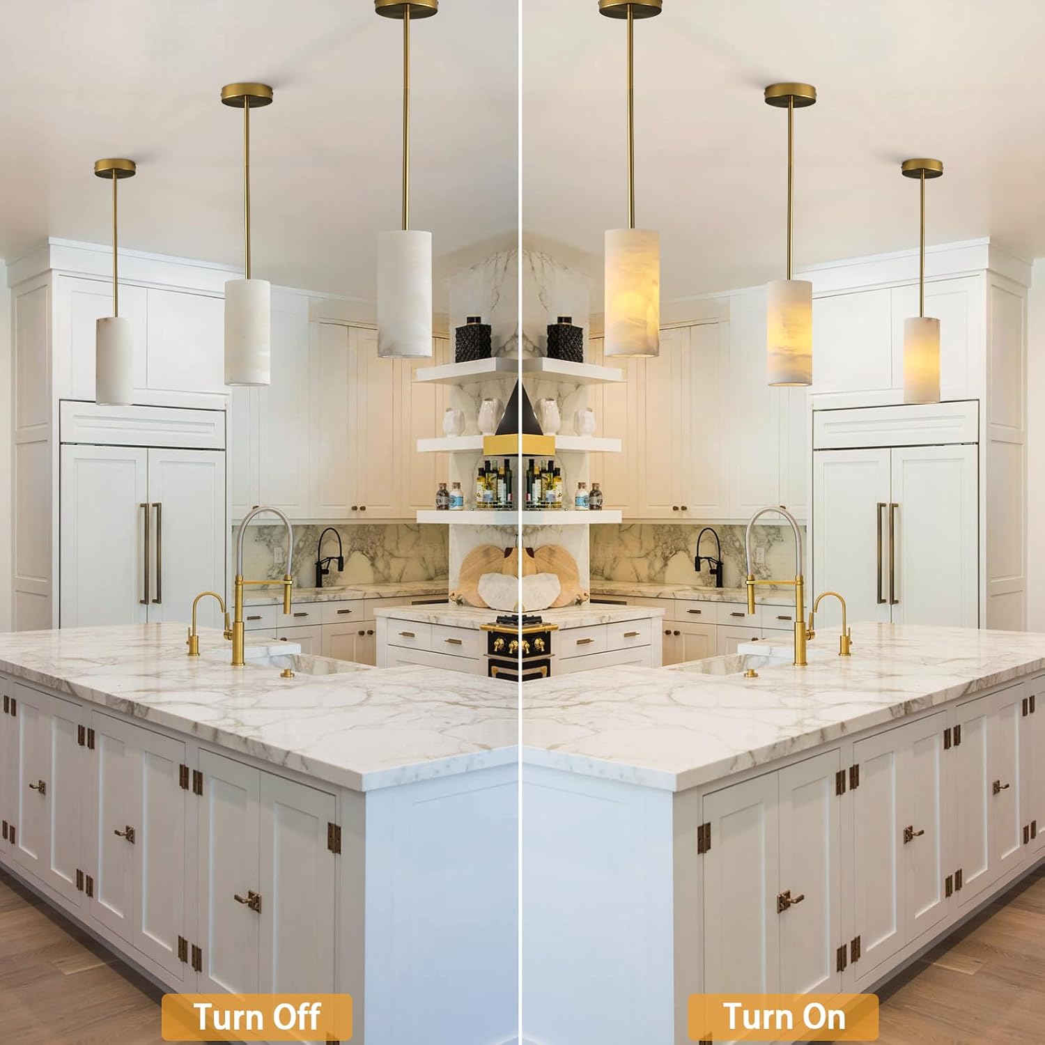 - 【Height Adjustable & Brightness】The alabaster pendant light is H 10‘’ , Φ 4'', Weight: 11.8lb. Installation with 6 connecting rods: 5.91'' 2pcs, 11.8'' 2pcs, 17.7'' 2pcs with a maximum length of 71'' (180cm). You can DIY the chandelier to your preferred height as needed. Compatible with 90% of dimmer switches on the market, freely adjust 10%-100% brightness, allowing you to customize your lighting atmosphere for any mood or occasion. (DIMMER NO INCLUDED).