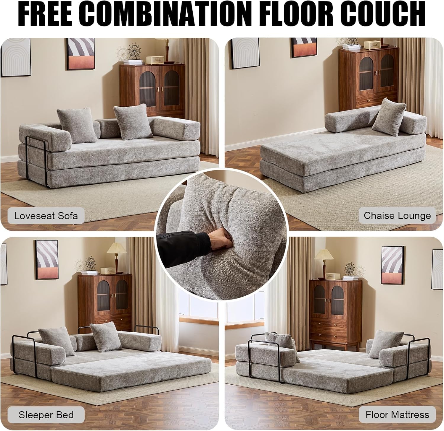 Convertible Sleeper Sofa Bed, Compression Folding Sofa with Pillow, No Assembly Required, Shape Frame, Floor Sofas Lounge Couchs for Living Room, Bedroom, Small Spaces(Chenille, 77''W, Light Grey)
