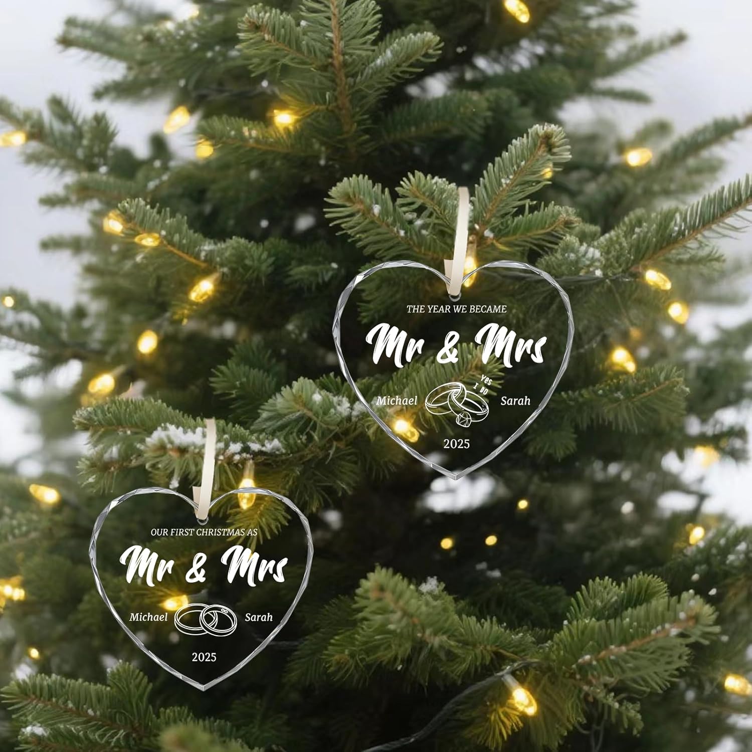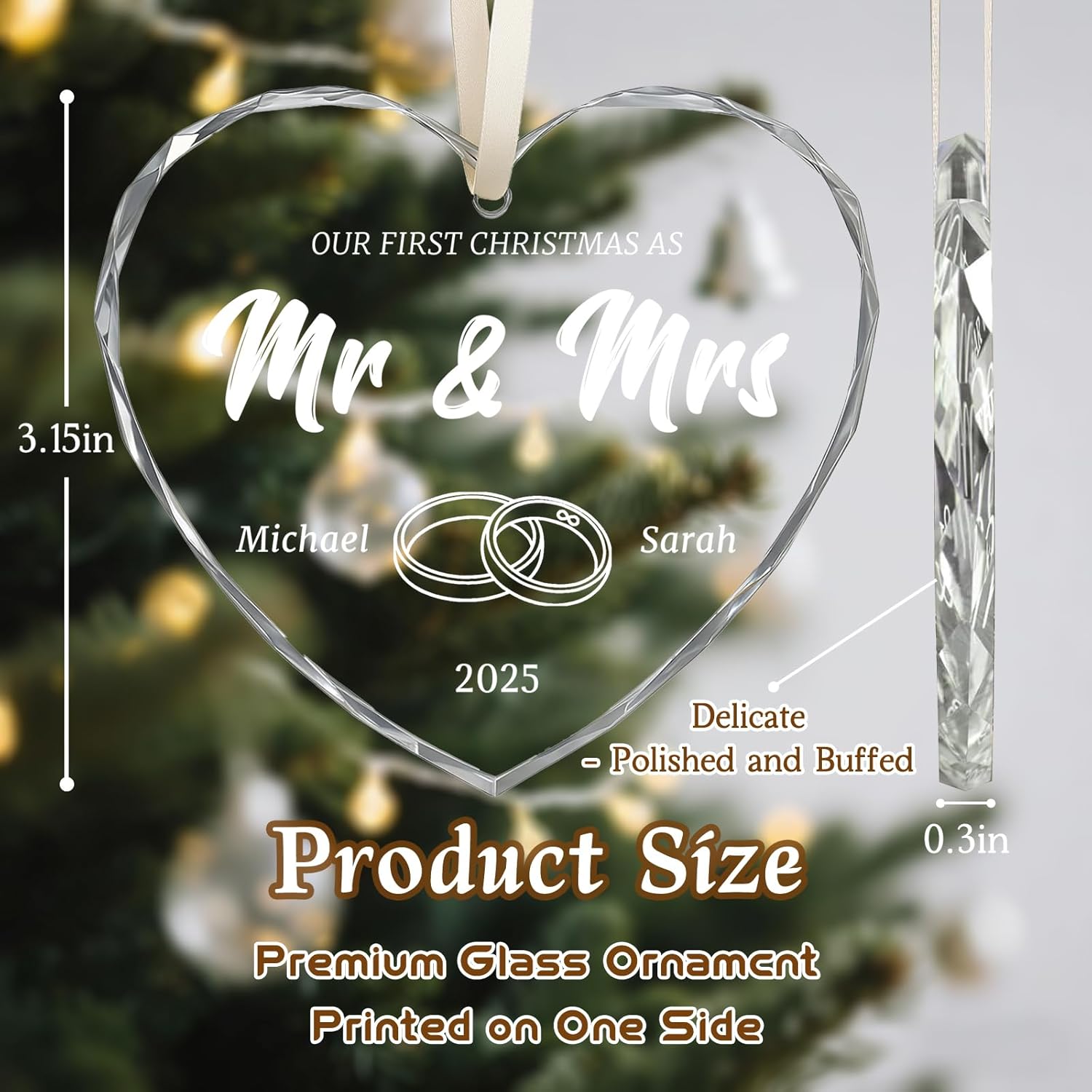 - Custom Wedding Ornament: The personalized wedding ornament feature classic heart and round designs. Choose your preferred pattern style, upload your photo, name, or date to customize a crystal ornament crafted to celebrate newlyweds and eternal love. Each custom glass ornament boasts a brilliant, lustrous surface with a premium feel. It serves as the perfect vessel to convey your heartfelt blessings
