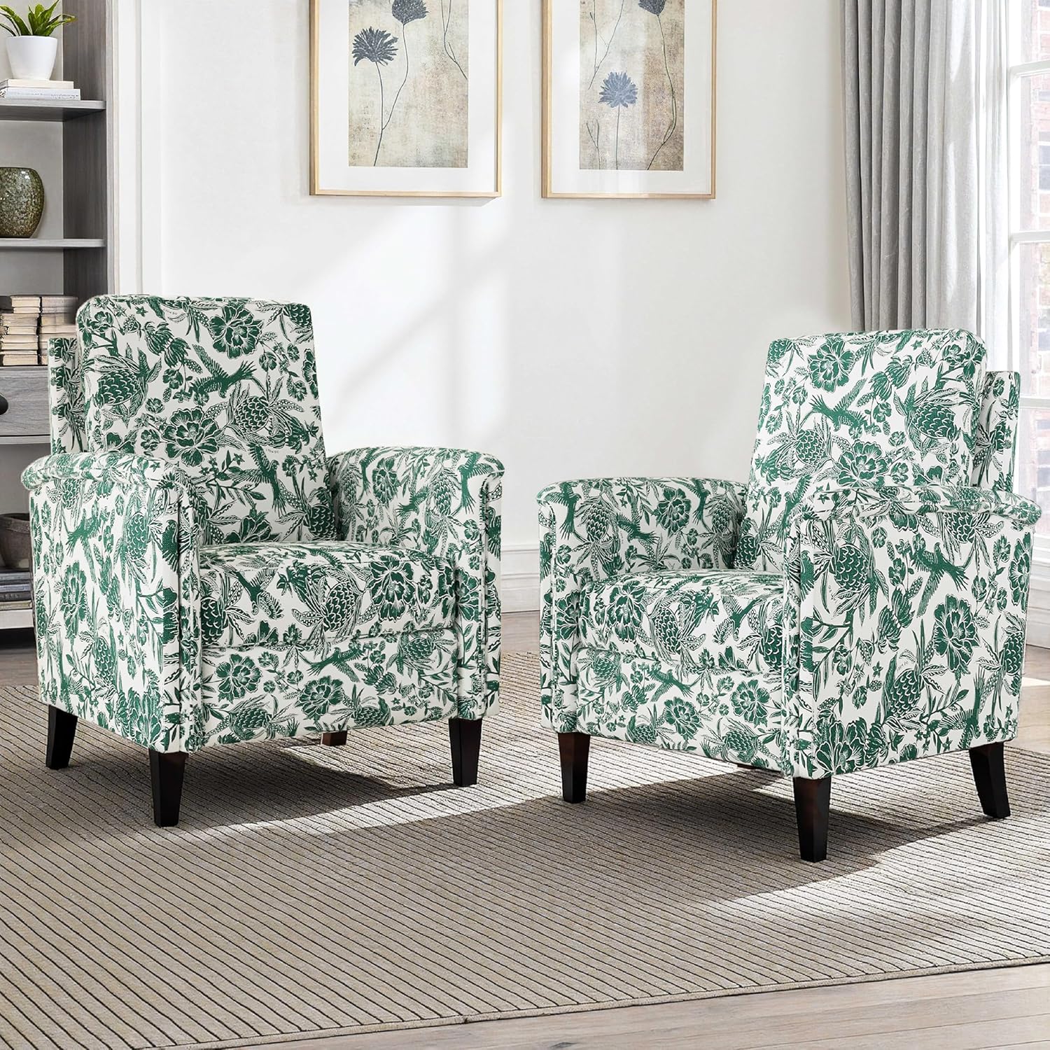 Floral Accent Chair Set of 2, High Back Upholstered Armchair with Solid Wooden Legs, Padded Armrest and Removable Comfortable Cushioned Seat Single Sofa for Living Room, Bedroom, Green