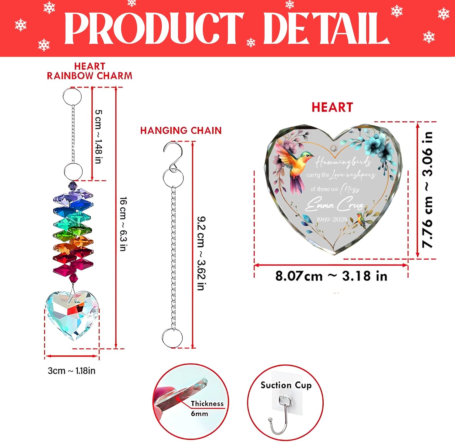 - Made from high-quality glass, this ornament is durable and elegantly designed with smooth edges and precise engraving. The attached rainbow suncatcher enhances the ornament’s beauty, adding a touch of sparkle and light to any room, especially when displayed on a Christmas tree.